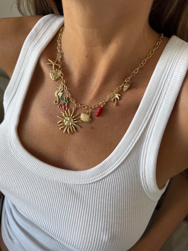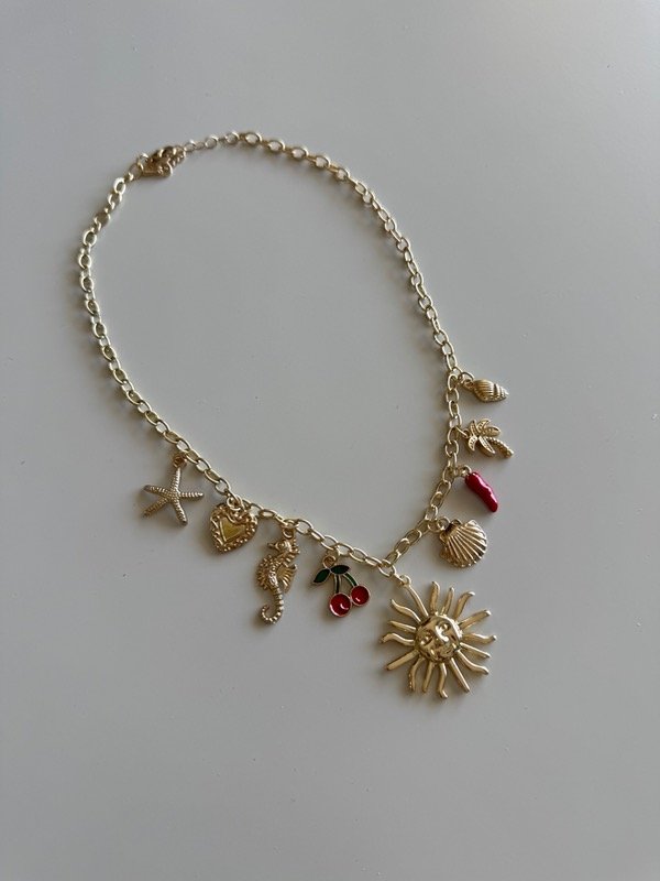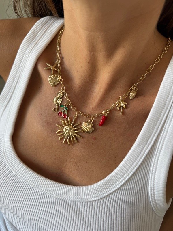 Collar metálic con colgantes de charms en distintas formas, tamaños y materiales. Cierre con mosquetón.