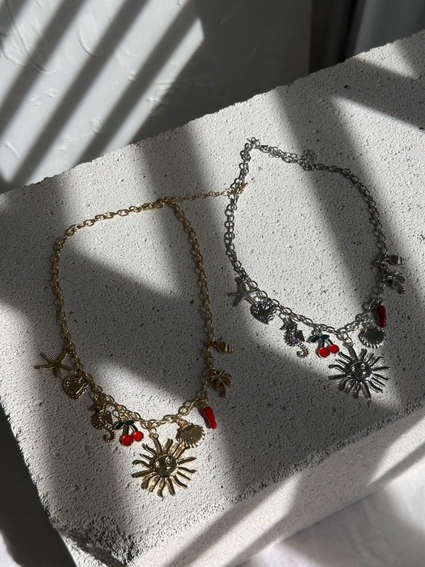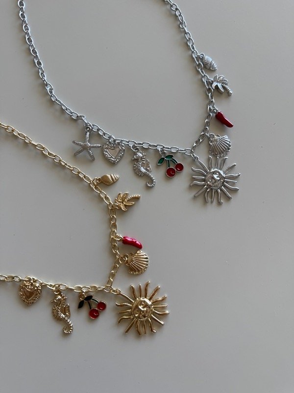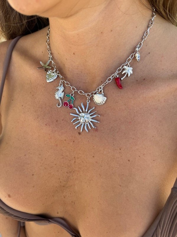 Collar metálic con colgantes de charms en distintas formas, tamaños y materiales. Cierre con mosquetón.