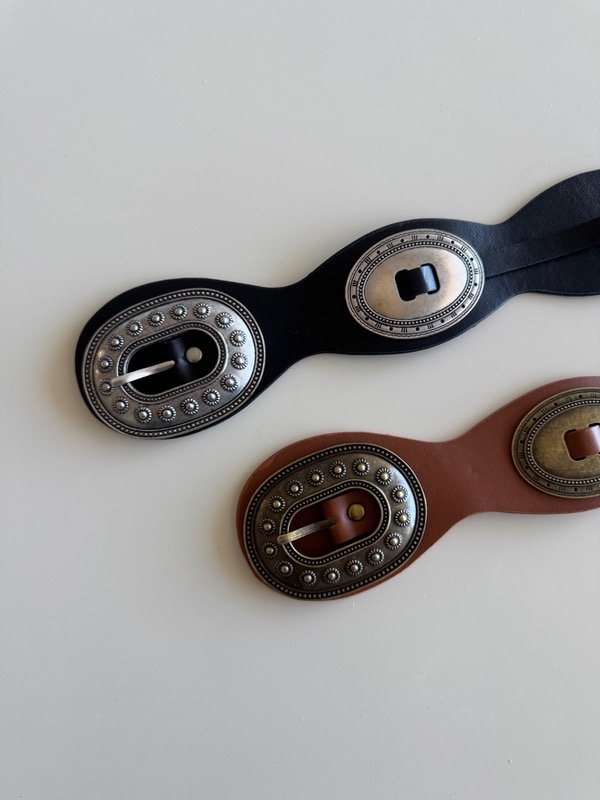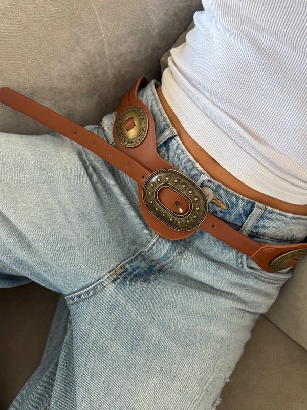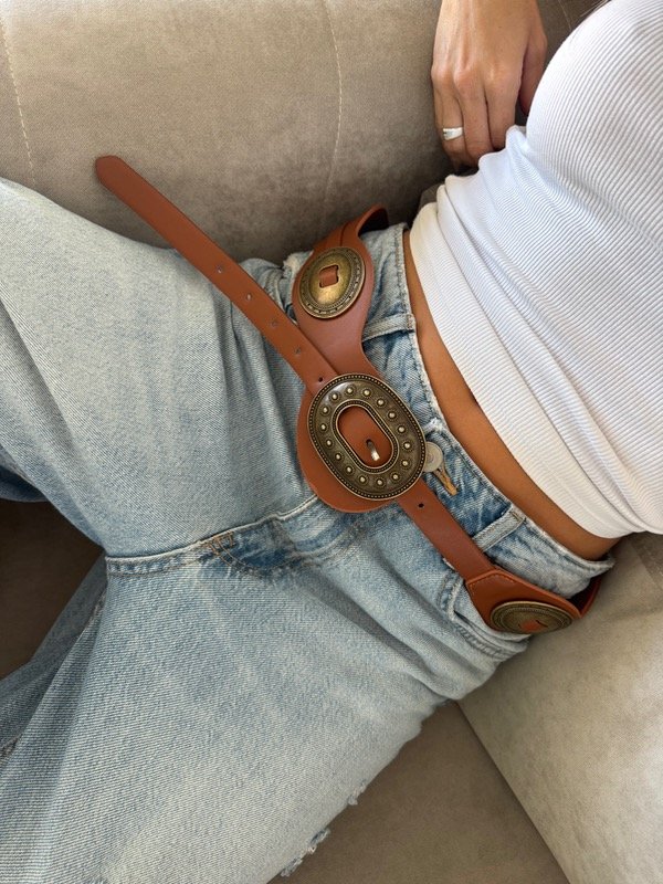 Faja de PU suela con hebilla y herrajes en bronce viejo, regulable e importada.