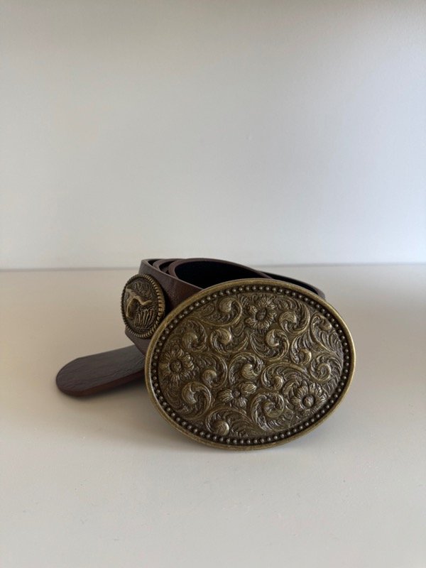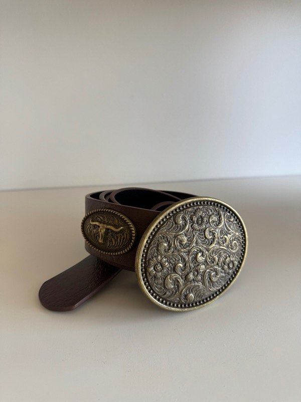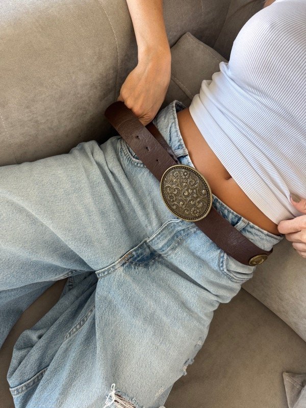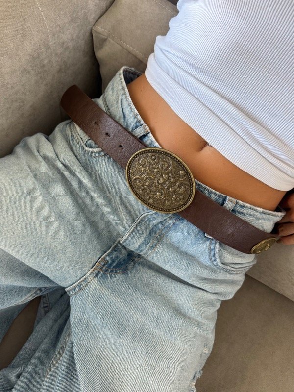 Faja de PU suela con hebilla y herrajes en bronce viejo, regulable e importada.